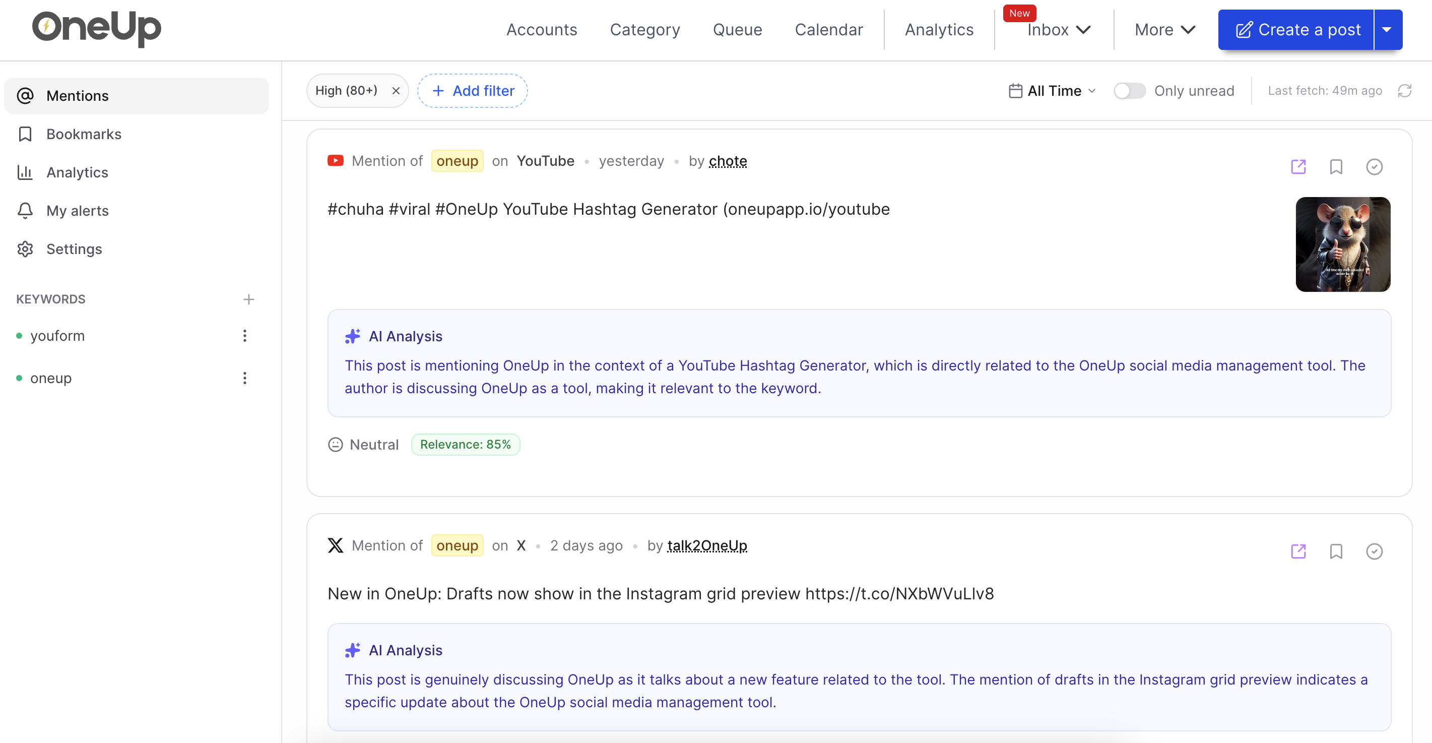 OneUp’s Social Listening currently monitors Reddit, YouTube, X, and Bluesky for mentions of your keywords. More social networks coming soon.